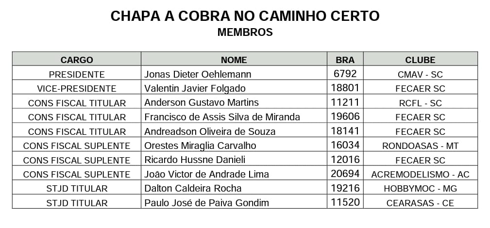 Informamos as entidades federadas e aeromodelistas em geral que ontem 07/03/2023 às 18:00 hs fechou a inscrição das chapas que pretendem se candidatar à direção da COBRA no quadriênio 23/26.